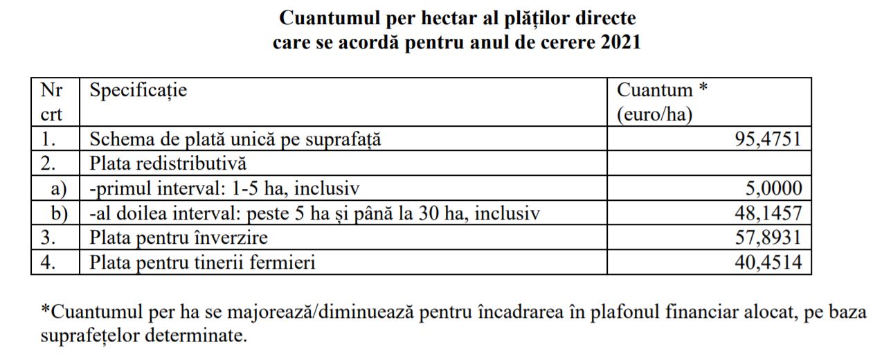 Se aprobă cuantumul per hectar al plăţilor directe pe suprafaţă care se acordă pentru anul de cerere 2021, prevăzute în anexa care face parte integrantă din prezenta hotărâre. Cuantumul per hectar al plăţii pentru tinerii fermieri nu depăşeşte 50% din cuantumul per hectar al schemei de plată unică pe suprafaţă.