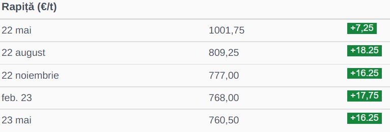La ora la care terminăm de redactat acest material, rapița a coborât la 997,00 euro/to.